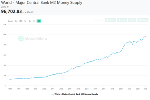 Global M2 money supply, representing total worldwide liquidity (cash, deposits) from major economies, hit a record high exceeding $22.2 trillion by late 2025. The trend shows rapid expansion after 2023 lows, directly correlating with boosted asset prices, including stocks.