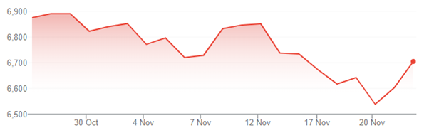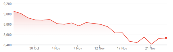 At the time of writing (25 November), the domestic market is down nearly 6%, reflecting another period of heightened volatility and mixed news-flow.